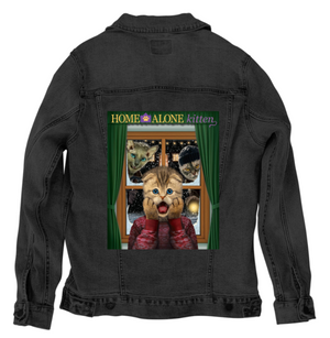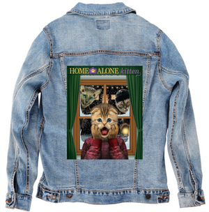 HOME ALONE by VINCENT HIE, digitally printed on a hand-made Denim Jacket with 3 color choices: Stonewash, White, or Black. Unisex XS S M L XL 2X 3X