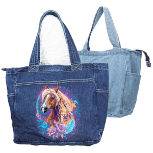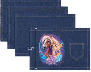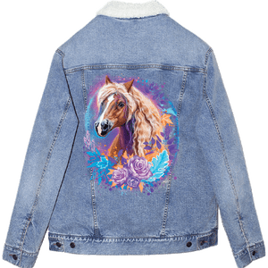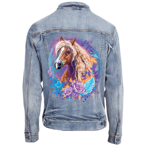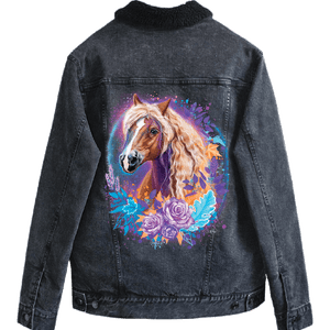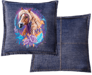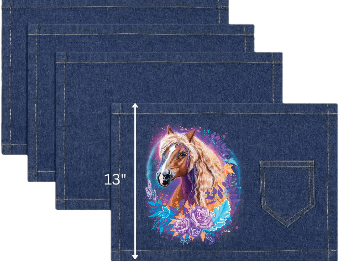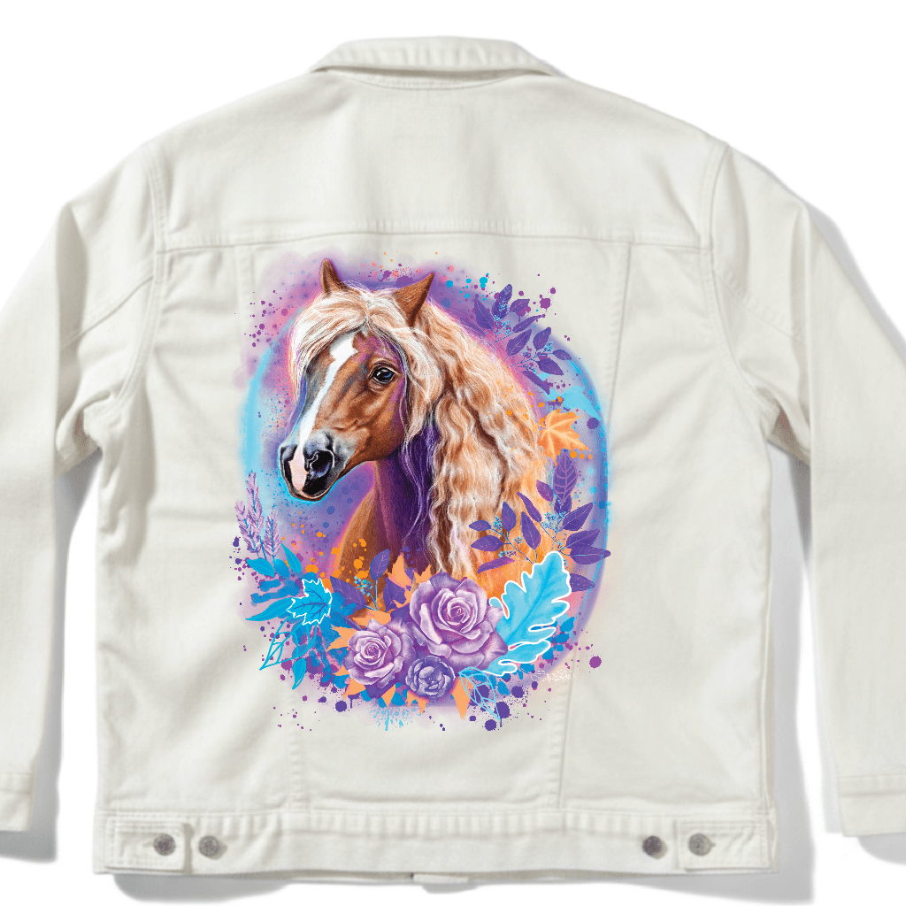 On stonewashed denim, the horse’s coat and mane soften immediately. The chestnut tones sink into the fabric, becoming warmer and slightly muted, while the blonde mane diffuses into gentle gradients. Fine hair details blur subtly, giving the mane a more tactile, worn-in feel rather than sharp definition.