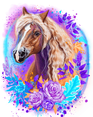 Around the horse, the environment dissolves into expressive color. Neon splashes bloom outward in turquoise, magenta, and electric blue, punctuated by stylized leaves and botanical shapes. At the lower edge, violet and lavender roses cluster together, their petals softly layered and luminous. These floral elements do not compete with the horse; instead, they frame it, reinforcing a sense of presence and reverence rather than narrative setting.