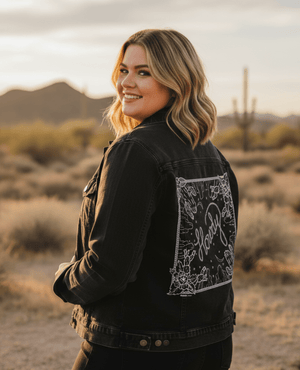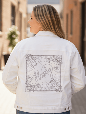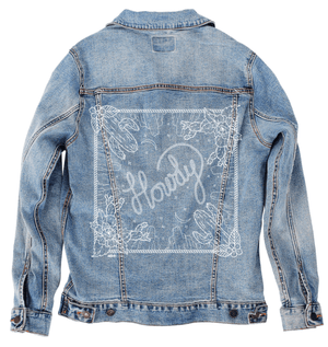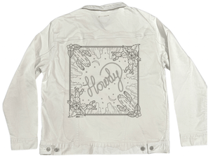 HOWDY SQUARE by KITSCH AND CURATE, digitally printed on a hand-made Denim Jacket with 3 color choices: Stonewash, White, or Black. Unisex XS S M L XL 2X 3X