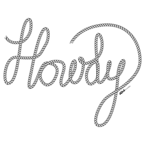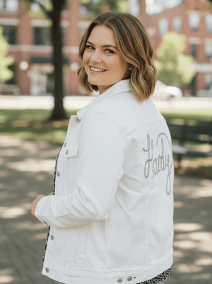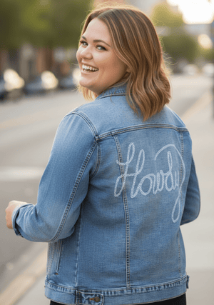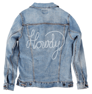 HOWDY TEXT by KITSCH AND CURATE, digitally printed on a hand-made Denim Jacket with 3 color choices: Stonewash, White, or Black. Unisex XS S M L XL 2X 3X