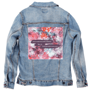 JUST DANCE by CANVAS and QUOTATIONS, digitally printed on a hand-made Denim Jacket with 3 color choices: Stonewash, White, or Black. Unisex XS S M L XL 2X 3X.