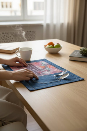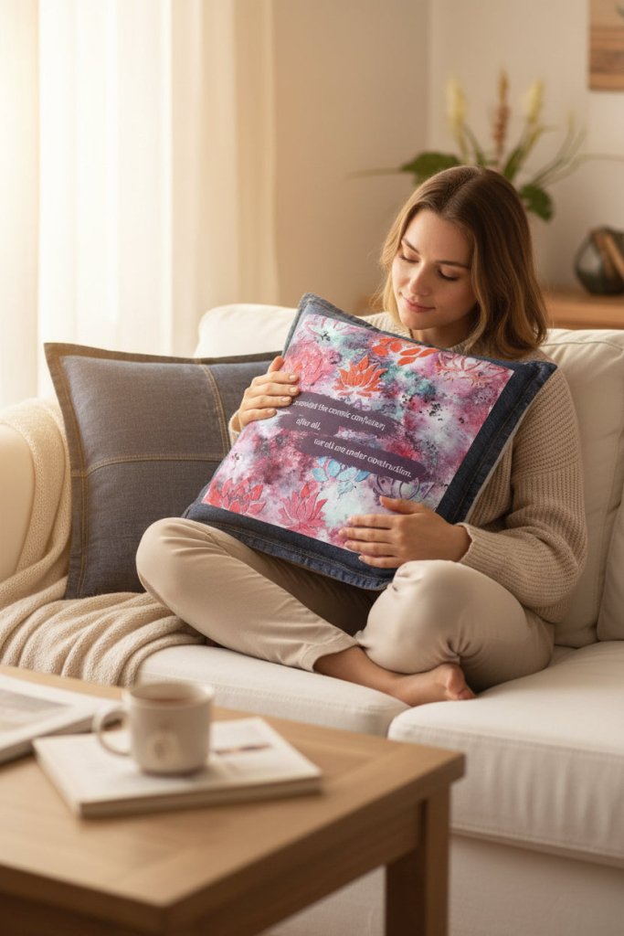 On black denim, the colors glow inward. Pinks, corals, and teals ignite against the dark base, while the plum bands feel grounded and intimate. The lotus stamps appear and disappear as the fabric moves, reinforcing motion rather than stability. The message feels whispered rather than announced.