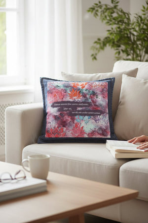 A shift in mood happens when you notice how the text does not erase the background. The marbled colors press right up to the bands. Lotus shapes continue above and below. Nothing pauses to make space for the words — the words exist within the chaos. The semicolon in the sentence becomes a visual hinge, a moment of balance between movement and acceptance.