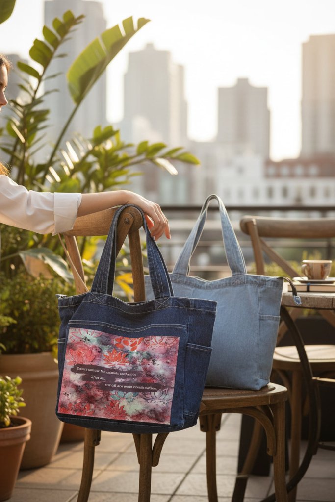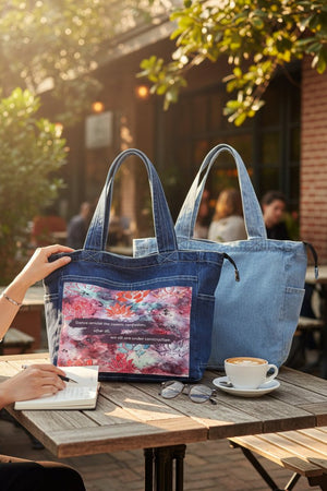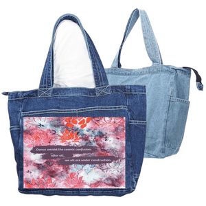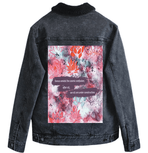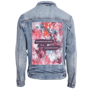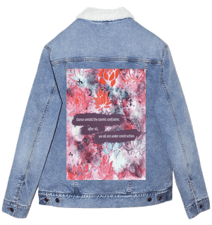 On stonewashed denim, the marbled colors soften into a hazy blend. Edges blur, lotus stamps mellow, and the background feels atmospheric and forgiving. The plum text bands sink slightly into the weave, becoming more tactile than graphic. The emotional tone shifts toward patience — construction as something ongoing and gentle.