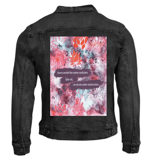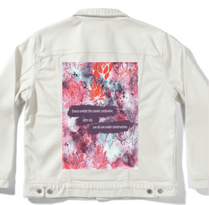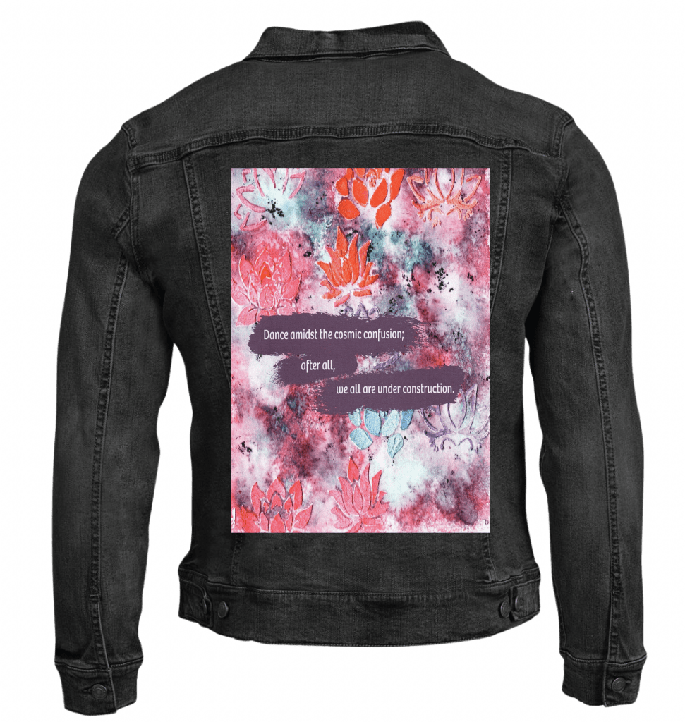On white denim, clarity takes hold. The lotus shapes separate more distinctly, the color contrasts sharpen, and the text becomes immediately legible from a distance. The chaos reads as intentional composition rather than noise. This clarity matters because it frames imperfection as choice, not accident.
