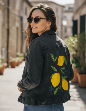 LEMONS by THEARTICSOUL, digitally printed on a hand-made Denim Jacket with 3 color choices: Stonewash, White, or Black. Unisex XS S M L XL 2X 3X
