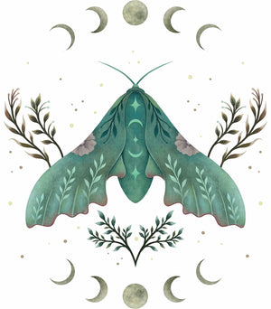 LUNA AND MOTH by EPISODIC DRAWING, digitally printed on a hand-made Denim Jacket with 3 color choices: Stonewash, White, or Black. Unisex XS S M L XL 2X 3X