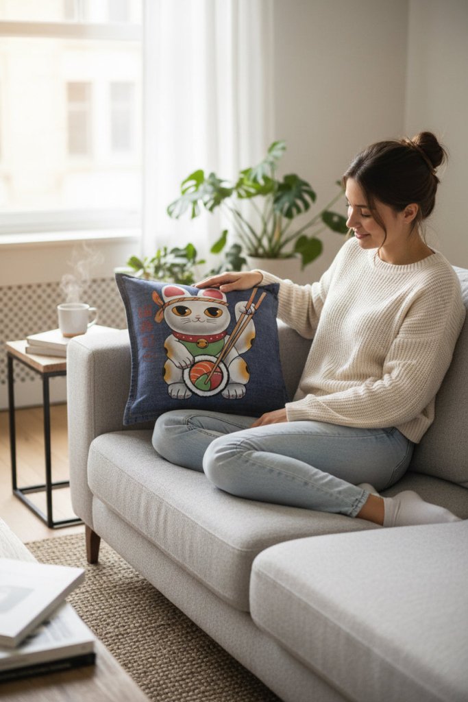 artwork like a clean display surface, making the cat’s pose feel intentional