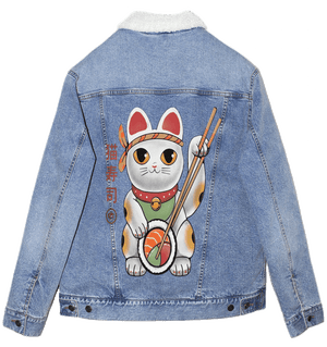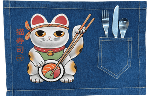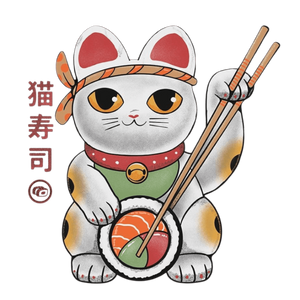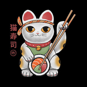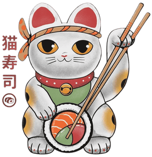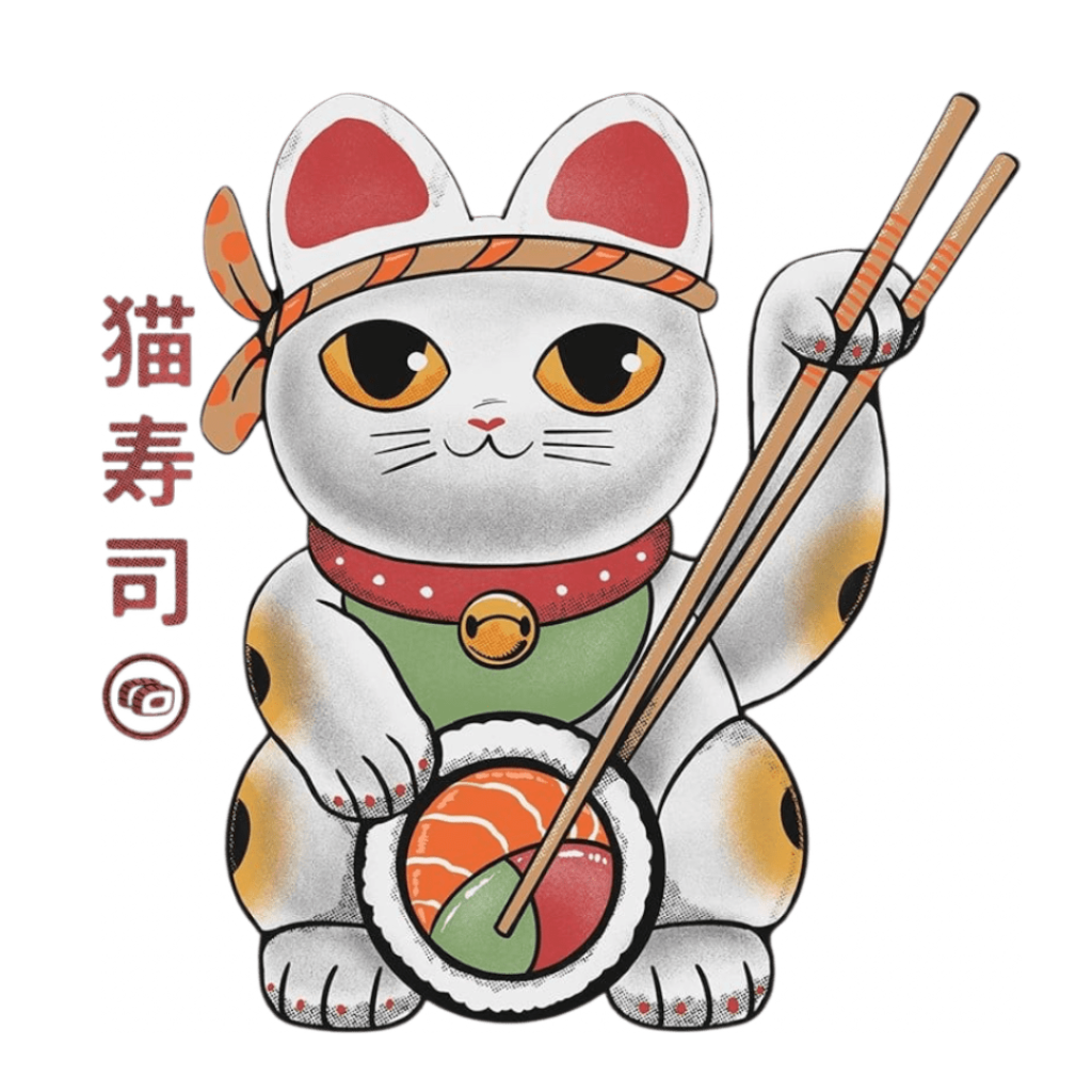 focal action happens at the paws. One paw rests firmly atop a large sushi roll