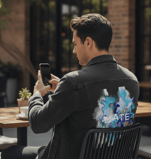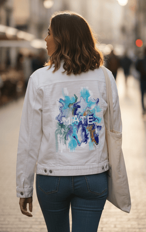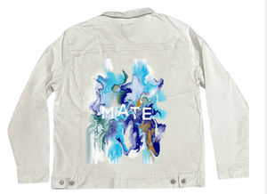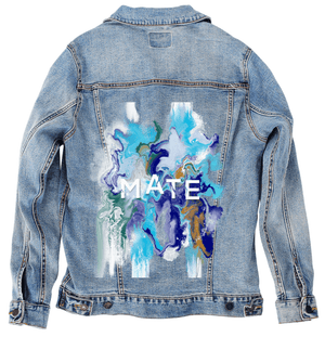 MATE OCEAN MARBLE by RaMir DESIGNS, digitally printed on DENIM products: Unisex Denim Jackets, tote bags, throw pillows, aprons, table place mats.