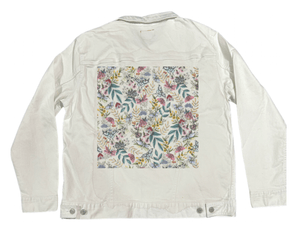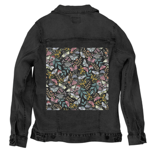 MIDNIGHT GARDEN by CECILIA BATTAINI, digitally printed on a hand-made Denim Jacket with 3 color choices: Stonewash, White, or Black. Unisex XS S M L XL 2X 3X