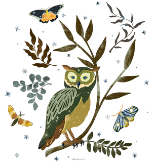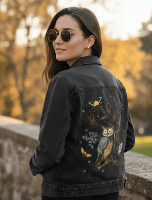 MOONLIT OWL by THEARTICSOUL, digitally printed on a hand-made Denim Jacket with 3 color choices: Stonewash, White, or Black. Unisex XS S M L XL 2X 3X