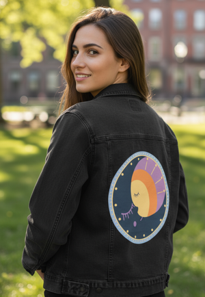 MOONPHASE by HEND SHEHATA, digitally printed on a hand-made Denim Jacket with 3 color choices: Stonewash, White, or Black. Unisex XS S M L XL 2X 3X