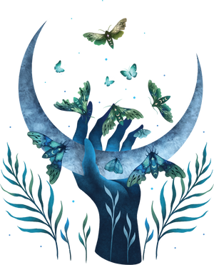 MOTH HAND by EPISODIC DRAWING, digitally printed on a hand-made Denim Jacket with 3 color choices: Stonewash, White, or Black. Unisex XS S M L XL 2X 3X