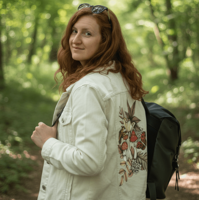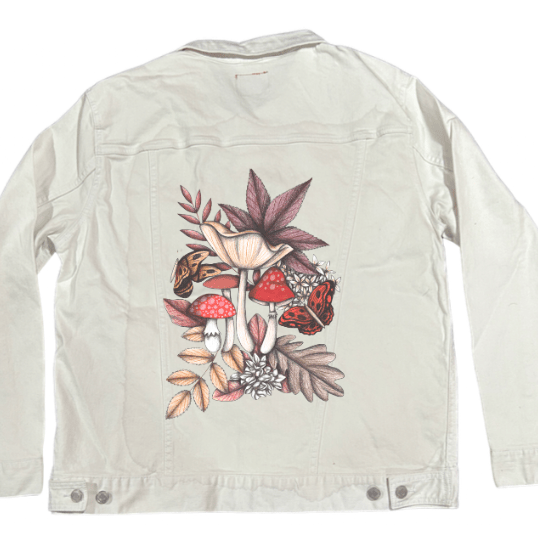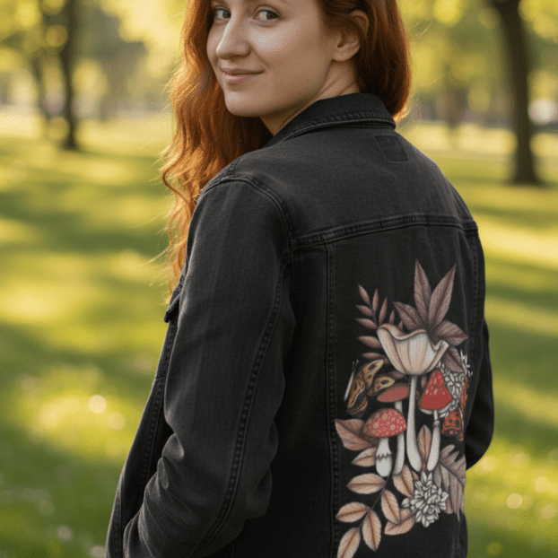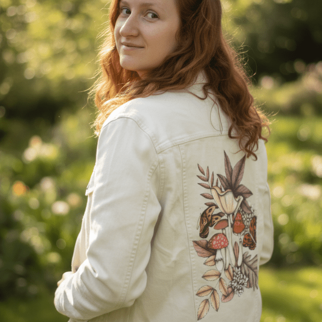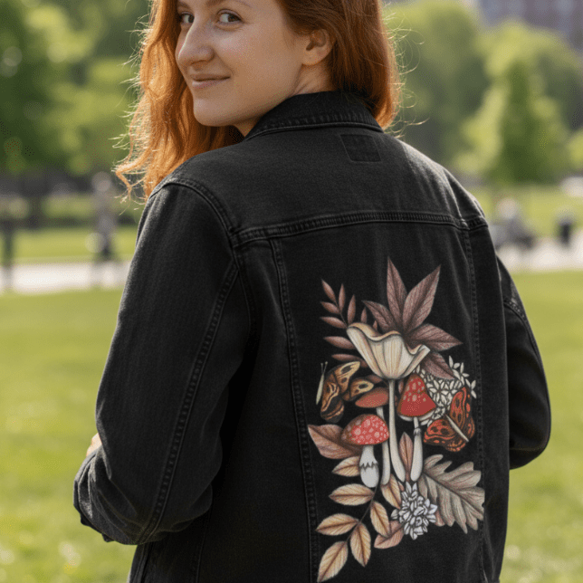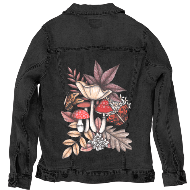 lines, allowing the leaves and mushrooms to blend slightly into the denim’s