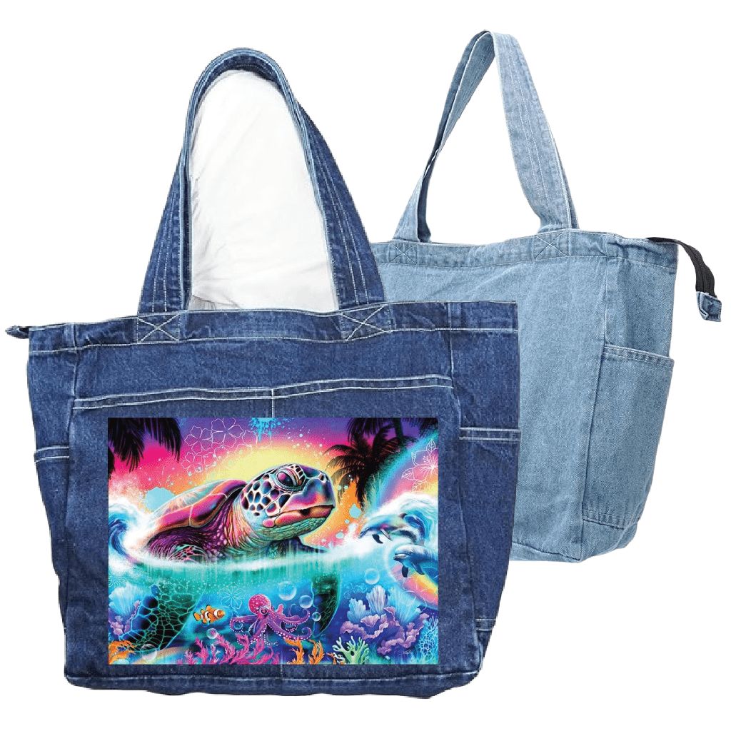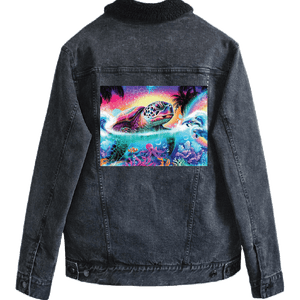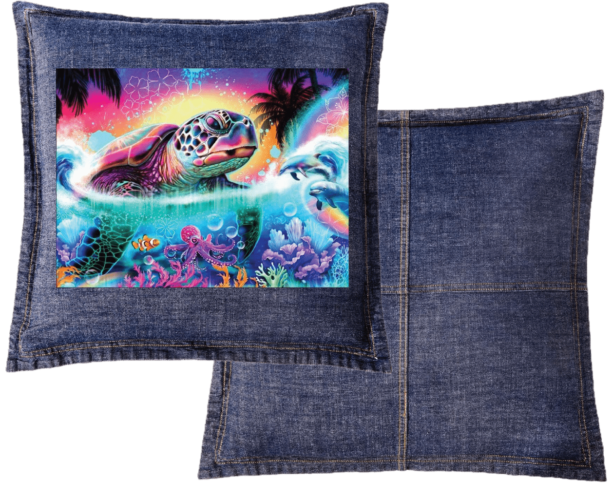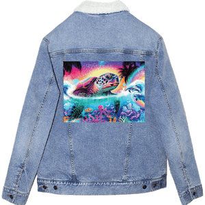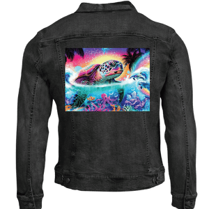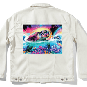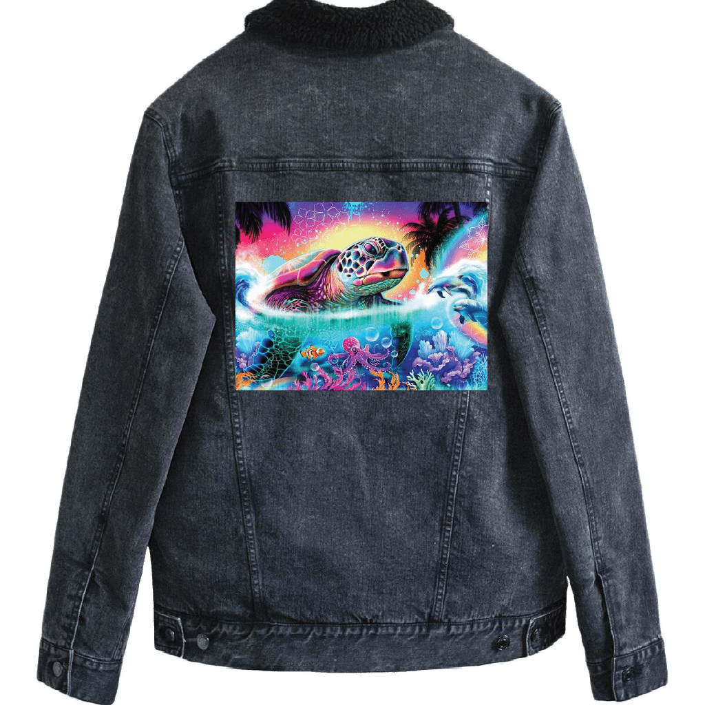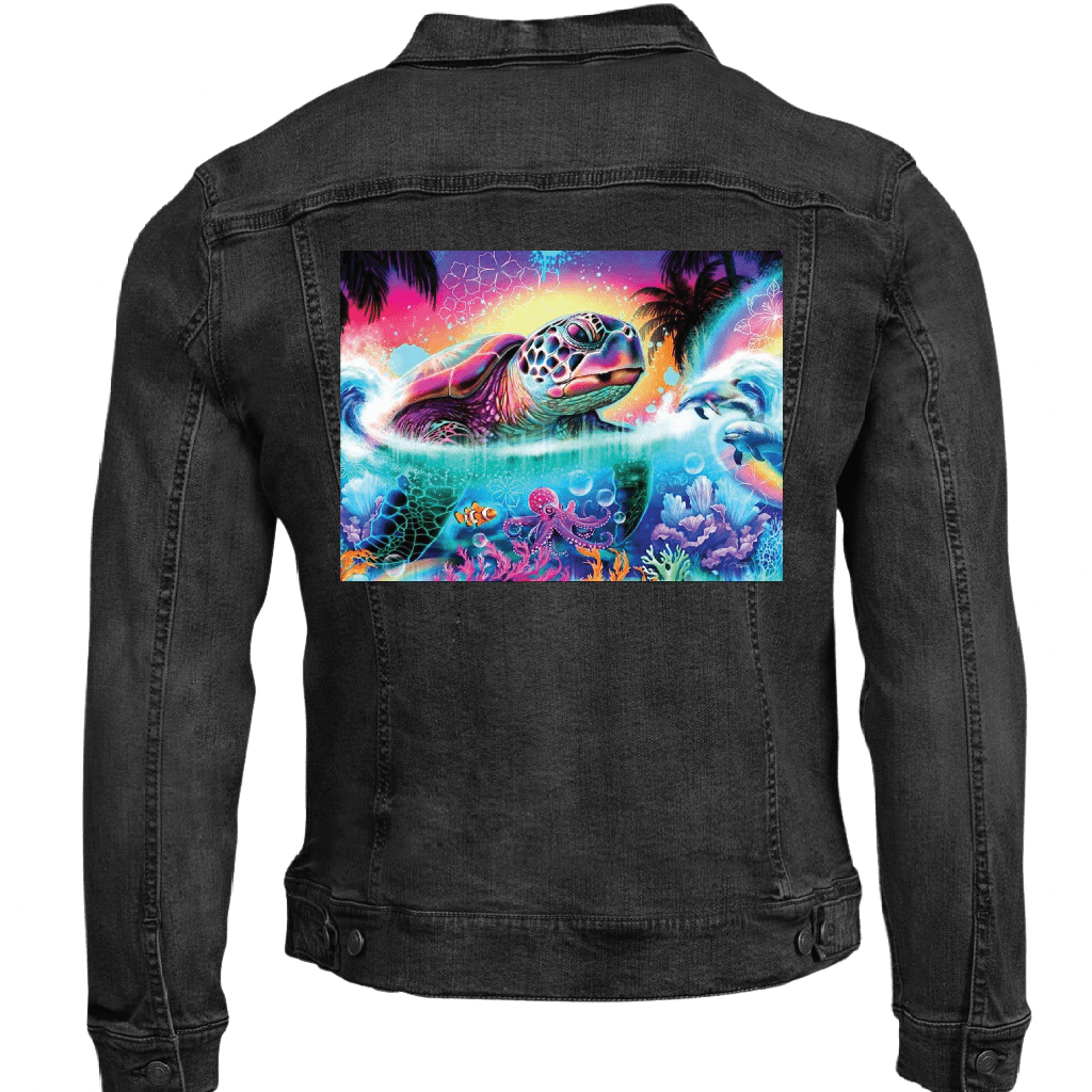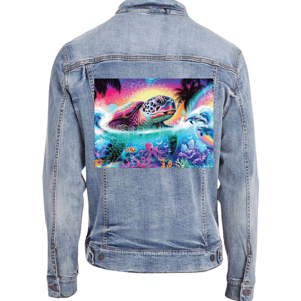 On stonewashed denim, the neon intensity softens into a dreamlike wash. Bright pinks and greens mellow into warmer pastels as pigment sinks into the worn twill. The turtle’s glowing patterns diffuse, blending more gently into surrounding blues. Coral and bubbles lose sharp definition, becoming atmospheric texture.