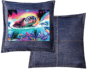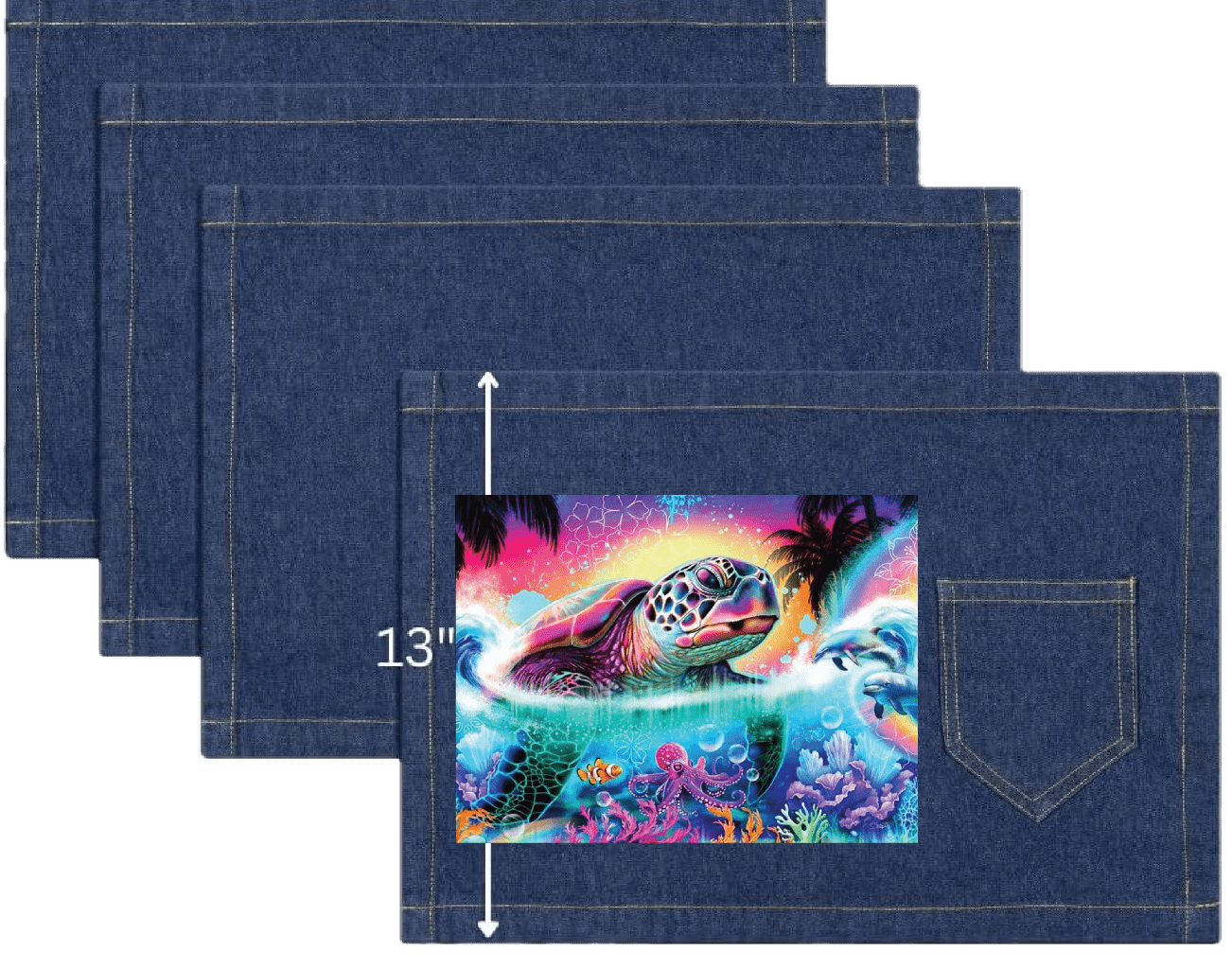 On black denim, the scene becomes electric and cinematic. The dark base absorbs shadowed areas, causing neon blues, pinks, and greens to glow intensely. The turtle appears almost backlit, its edges radiant against darkness. The coral reef becomes jewel-like, its colors concentrated and rich.