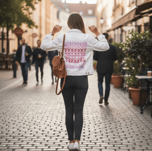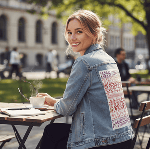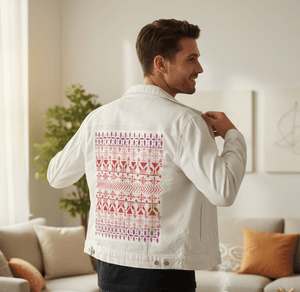 NORWEGIAN PATTERN by Catcoq, digitally printed on a hand-made Denim Jacket with 3 color choices: Stonewash, White, or Black. Unisex XS S M L XL 2X 3X