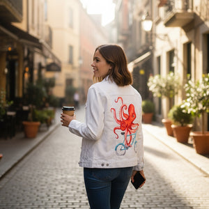 OCTOPUS RIDING A BICYCLE by Amelie Legault,digitally printed on a hand-made Denim Jacket with 3 color choices: Stonewash, White, or Black. Unisex XS S M L XL 2X 3X