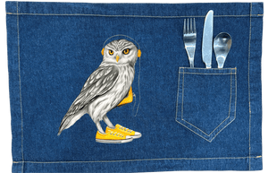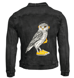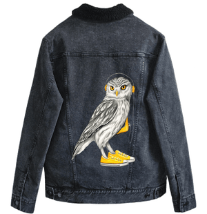 black denim, the scene deepens and quiets. The owl’s gray feathers compress