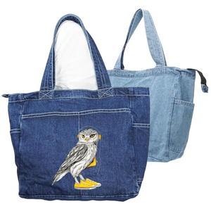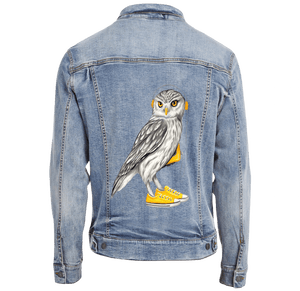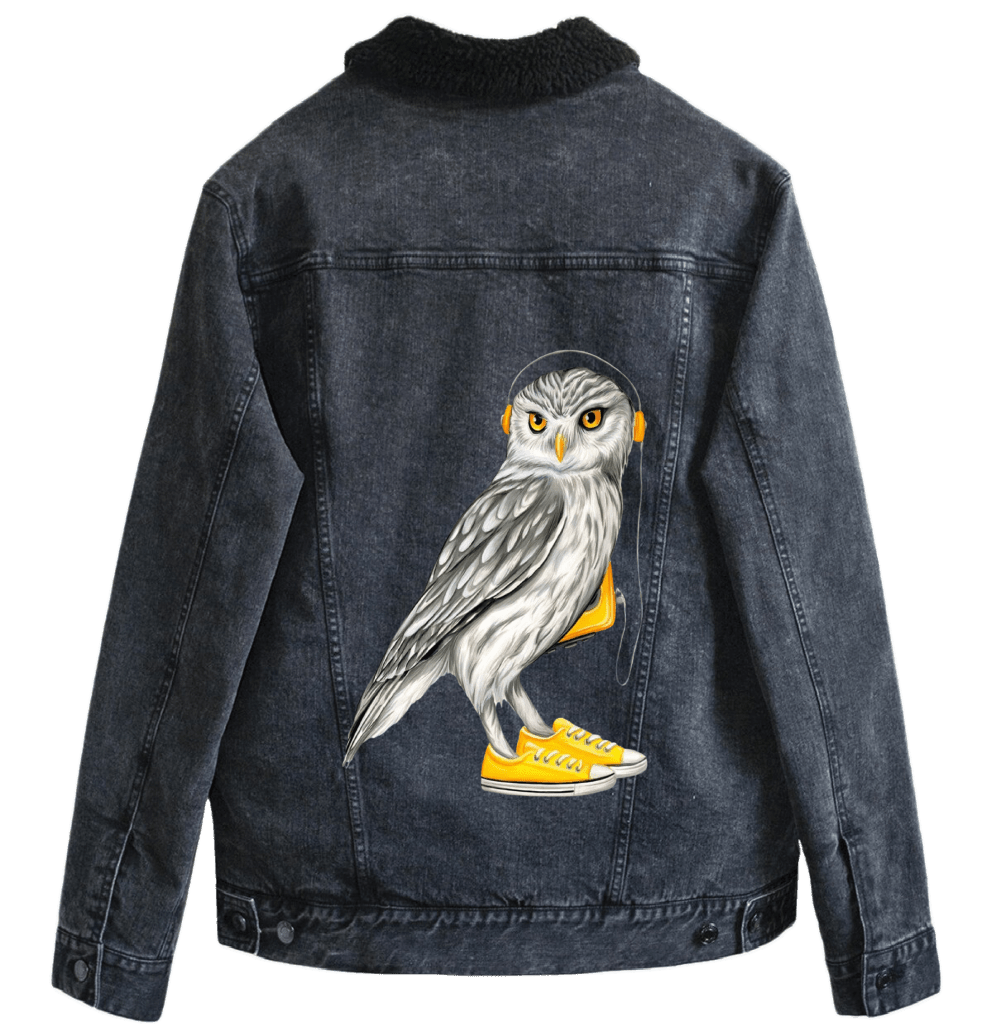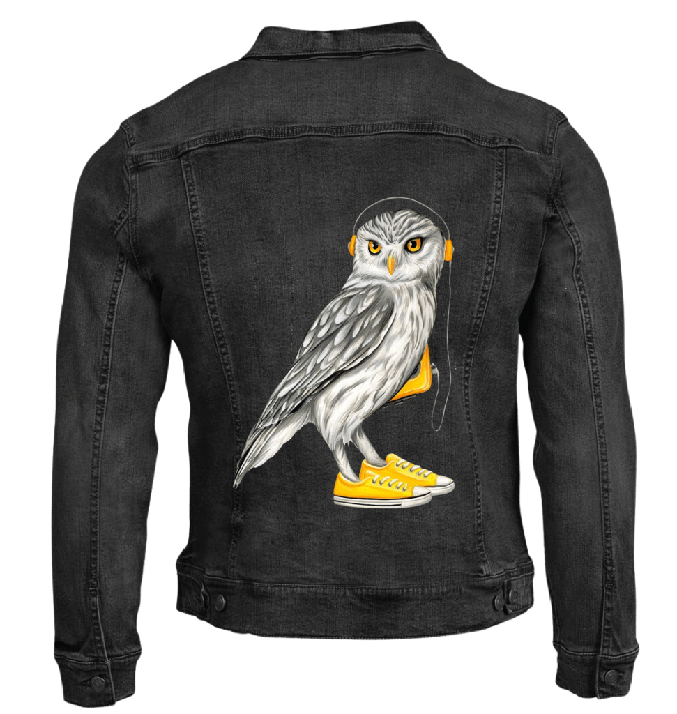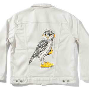 Your eye lingers on the feathers. Along the chest, pale gray strokes overlap one another in gentle, downward sweeps, each stroke thickening slightly near its base before tapering off. A faint ridge forms where lighter feathers meet darker ones near the shoulder, creating a subtle seam of texture. On denim, pigment settles into the weave along this ridge, causing the transition to break into tiny tonal shifts. It matters because the owl’s body stops feeling