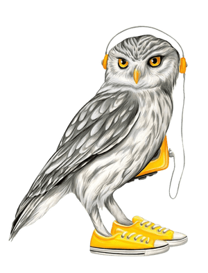 A gray-and-white owl standing upright while wearing bright yellow sneakers and orange headphones connected by a thin cord. the owl’s layered feathers are rendered in soft gray strokes with lighter highlights along the chest and wings, and its large golden eyes look forward with steady focus. the background s turquoise with scattered pastel squiggles and dash patterns. this artwork is