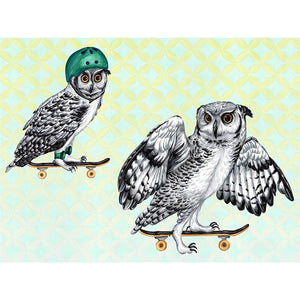 OWLS ON SKATEBOARDS, by Amelie Legault,digitally printed on a hand-made Denim Jacket with 3 color choices: Stonewash, White, or Black. Unisex XS S M L XL 2X 3X