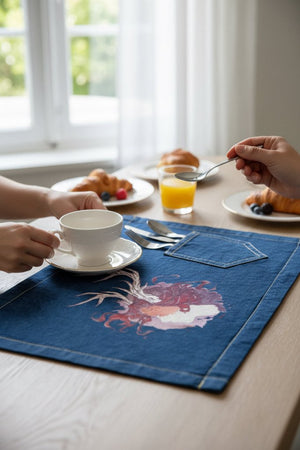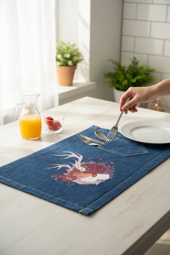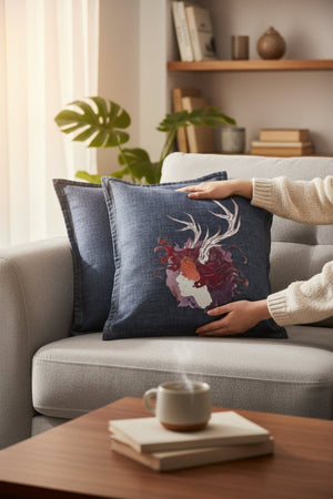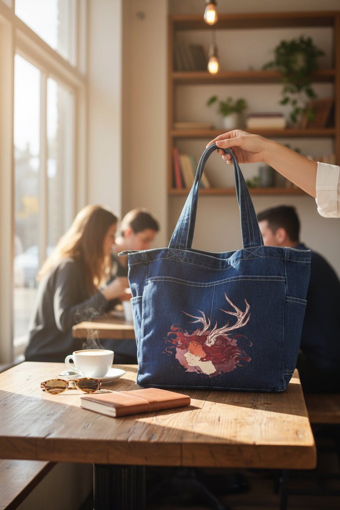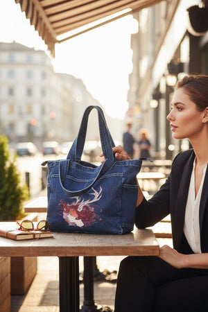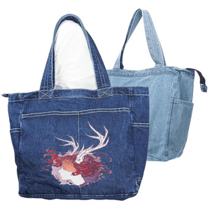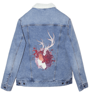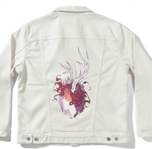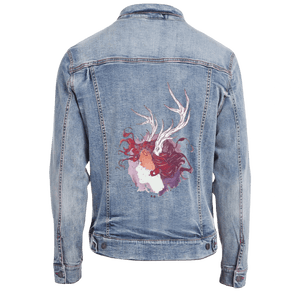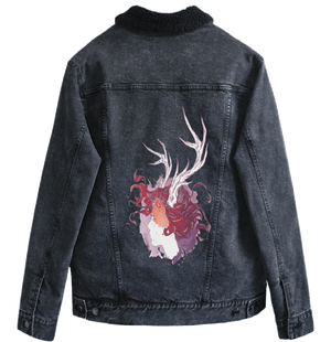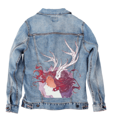 black denim, the artwork compresses into intimacy. The pale face and antlers