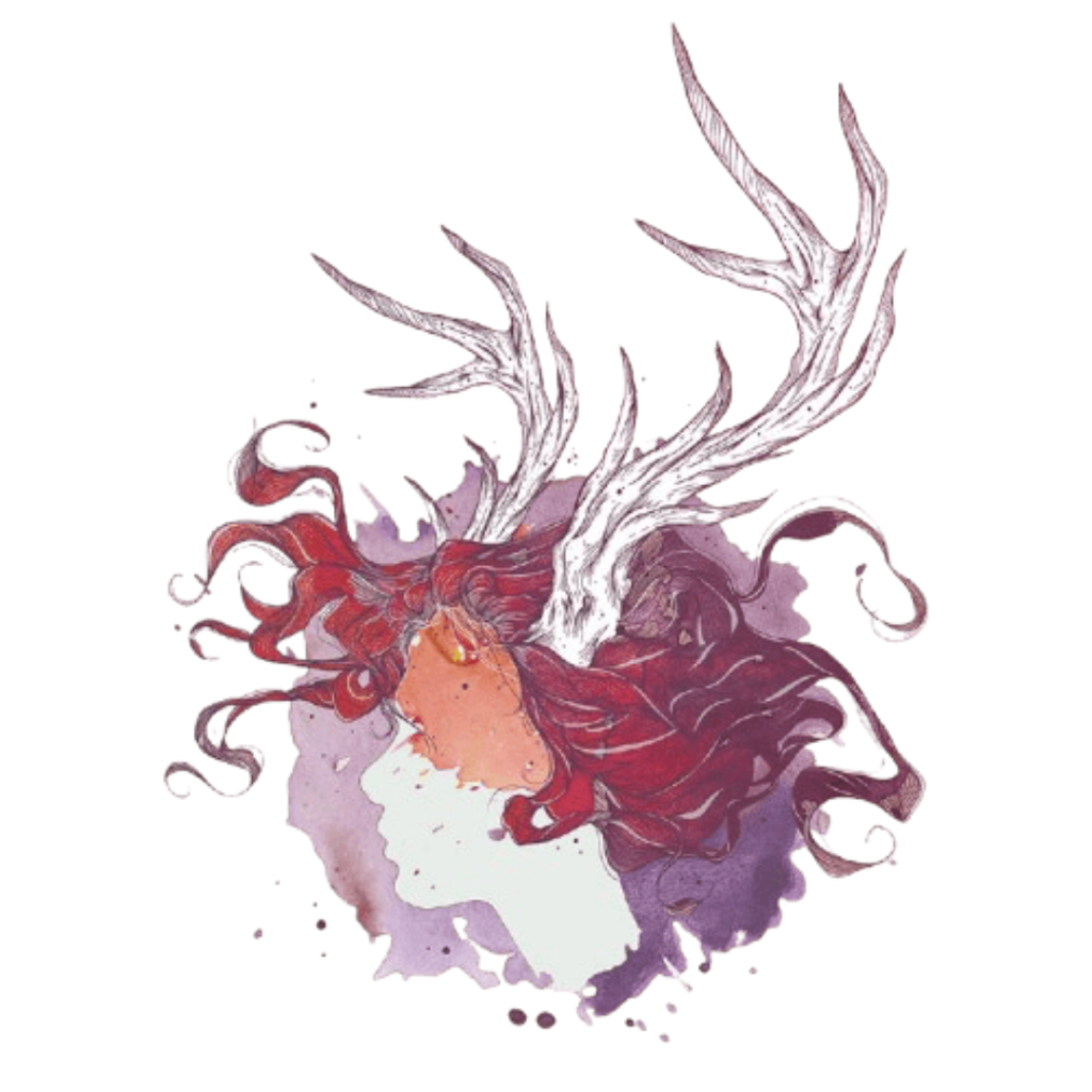 hair flowing outward in thick, curling strands. white branching antlers rise