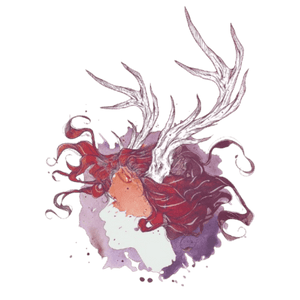 visual plane. Stillness settles here — hair in motion, antlers rising, face