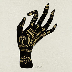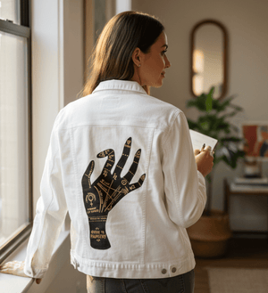 PALMISTRY by Catcoq, digitally printed on a hand-made Denim Jacket with 3 color choices: Stonewash, White, or Black. Unisex XS S M L XL 2X 3X