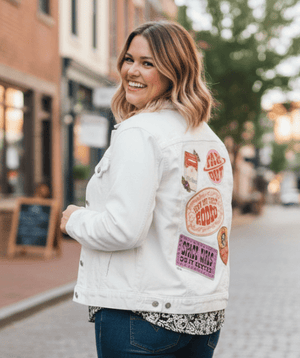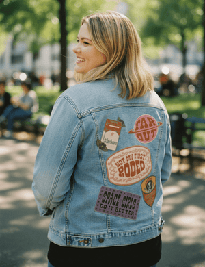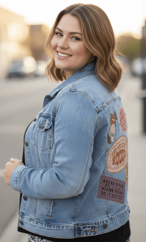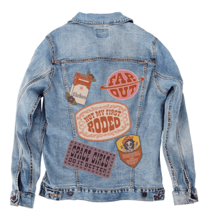 PATCHES ALL NoBG by KITSCH AND CURATE, digitally printed on a hand-made Denim Jacket with 3 color choices: Stonewash, White, or Black. Unisex XS S M L XL 2X 3X