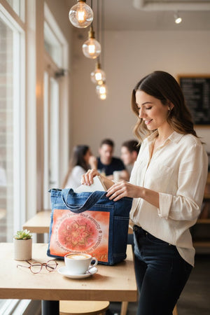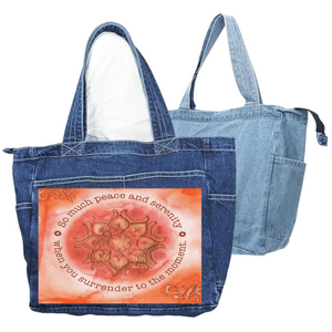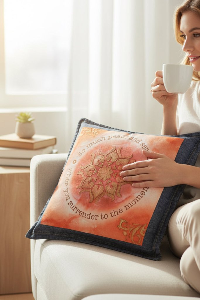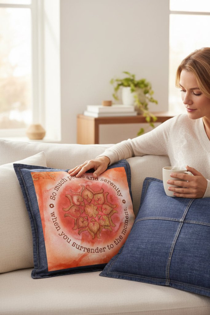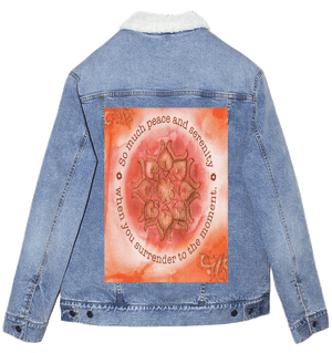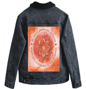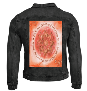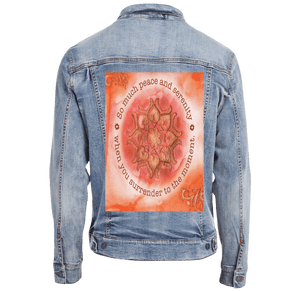 On stonewashed denim, the coral and peach background softens further, becoming almost cloud-like as pigment diffuses into the worn grain. The gold mandala mellows into a warm, embedded glow, less reflective and more intimate. The emotional tone shifts toward quiet acceptance — calm revisited over time.