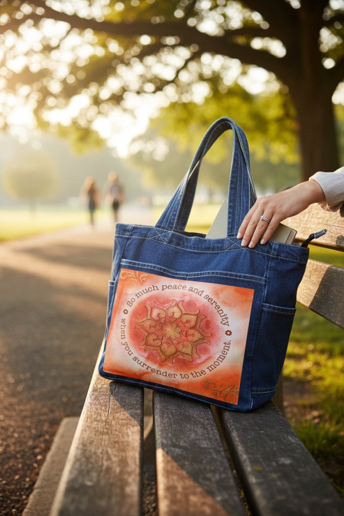 On black denim, the background deepens into ember-like warmth while the gold mandala glows forward with richness. The circular text feels closer, more intimate, as if spoken softly rather than displayed. As the fabric folds, highlights along the gold catch and release light, reinforcing the sense of presence in motion.