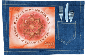 On white denim, clarity takes hold. The gold shapes sharpen, the heart forms become easy to trace, and the circular text reads cleanly from a distance. The contrast between warm background and metallic center feels balanced and intentional. This clarity matters because it frames serenity as a conscious choice, not a fleeting feeling.