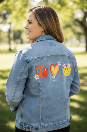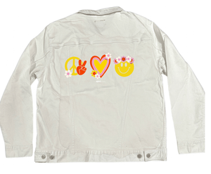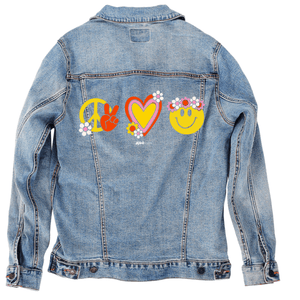 PEACE LOVE HAPPINESS by KITSCH AND CURATE, digitally printed on a hand-made Denim Jacket with 3 color choices: Stonewash, White, or Black. Unisex XS S M L XL 2X 3X