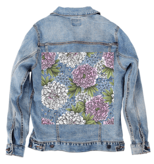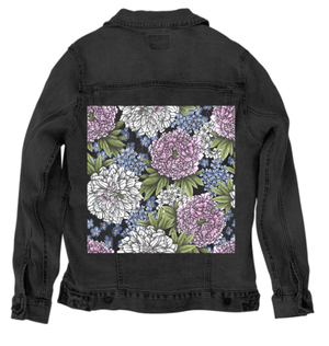 PEONIES by CECILIA BATTAINI, digitally printed on a hand-made Denim Jacket with 3 color choices: Stonewash, White, or Black. Unisex XS S M L XL 2X 3X
