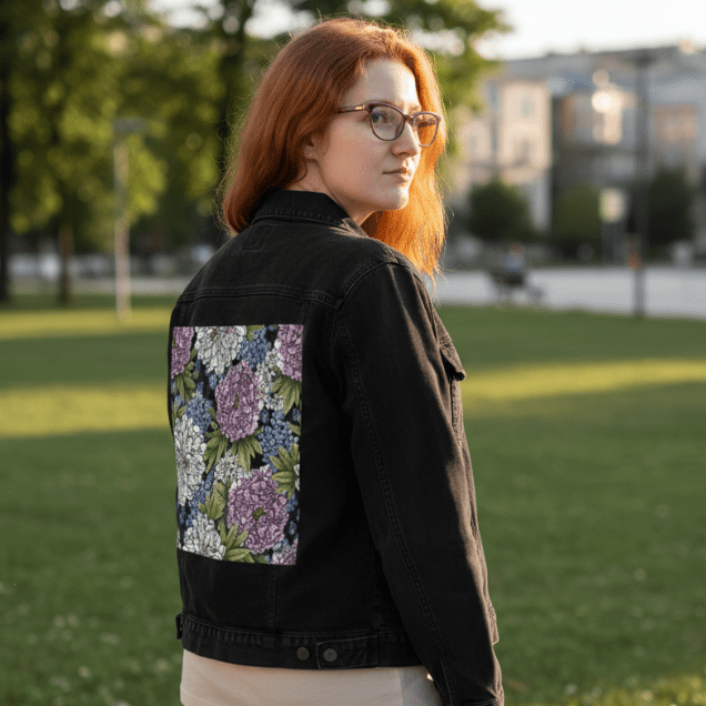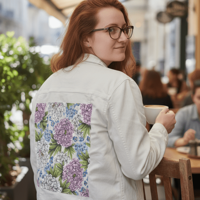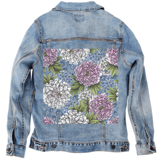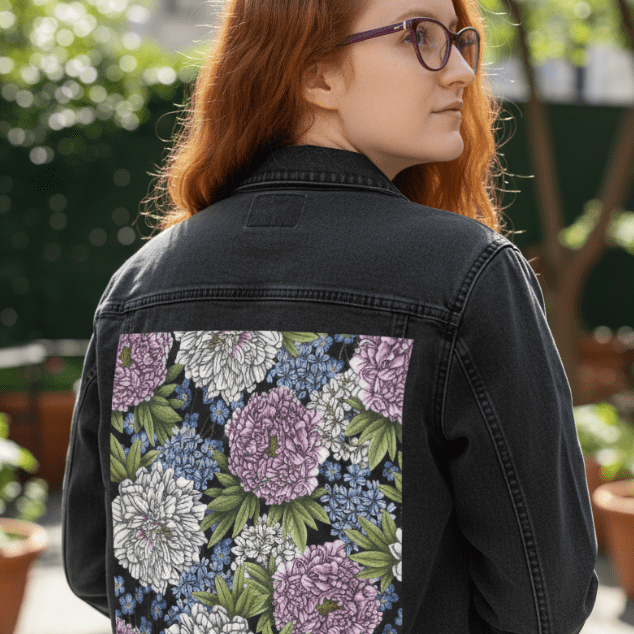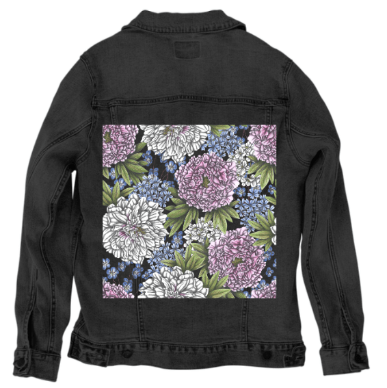 On black denim, the artwork becomes rich and dramatic. The background visually disappears, allowing the peonies to emerge with strong contrast and dimensional weight. White blooms glow against the dark surface, while pink peonies deepen into saturated rose tones. The small blue flowers become striking points of color, punctuating the composition and guiding the eye across the design. Overlapping leaves and petals gain depth and presence, creating a lush, immersive floral statement that feels bold yet refined.