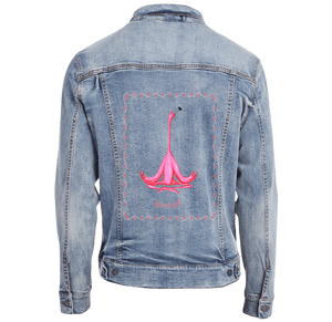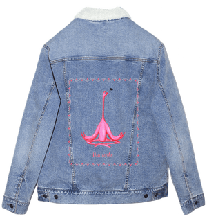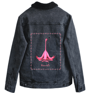 black denim, the scene turns inward. The pink flamingo glows against the dark