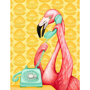 PINK FLAMINGO ON THE PHONE 1by Amelie Legault,digitally printed on a hand-made Denim Jacket with 3 color choices: Stonewash, White, or Black. Unisex XS S M L XL 2X 3X