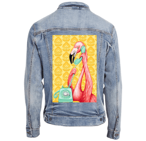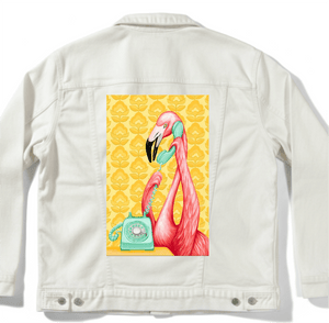 On white denim, clarity takes hold. Individual feather strokes separate cleanly along the neck, revealing the precise direction of the brush. The contrast between pink feathers and black beak sharpens, and the mint phone becomes crisp and graphic. The spiral cord reads distinctly, each loop defined. This clarity shifts the emotional tone toward alert presence — connection felt clearly, not quietly. The yellow background brightens on white denim, and the floral pattern becomes decorative and playful. As the jacket moves, contrast remains stable, giving the artwork a lively, conversational energy that feels open and awake.