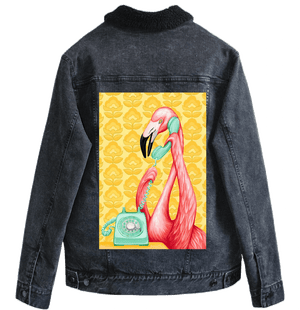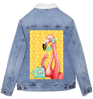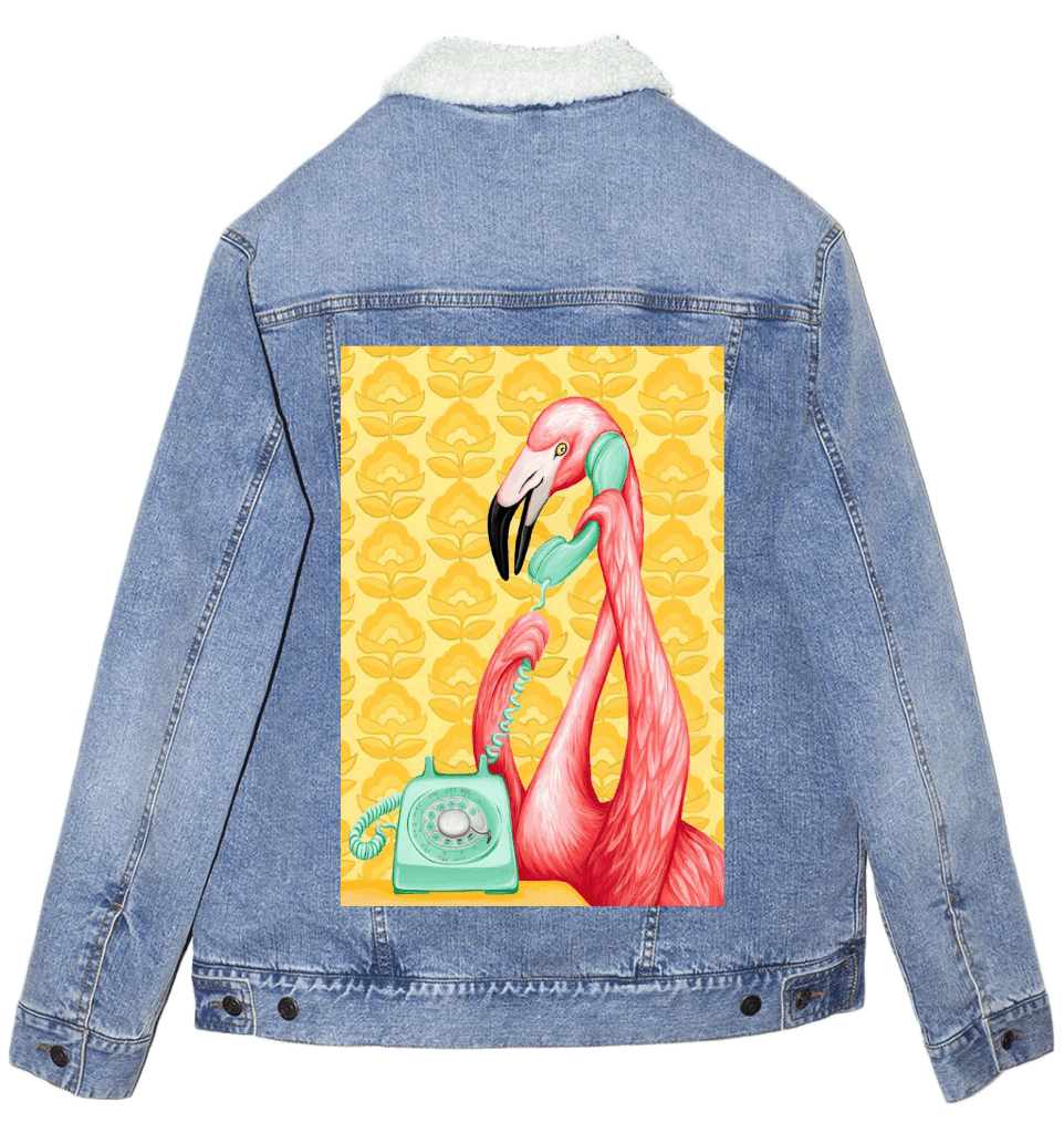 “PINK FLAMINGO ON THE PHONE1 with yellow background” by Amélie Legault Digitally printed by DenimINK on your choice of denim products: unisex jackets XS-3X, fleece-lined jackets, tote bags, throw pillows, table placemats, aprons. Ships Worldwide. Hand-crafted in USA. PINK FLAMINGO ON THE PHONE1 with yellow background by Amélie Legault
