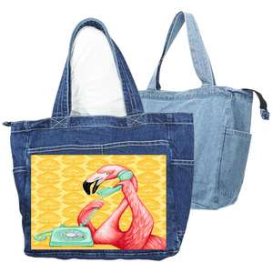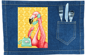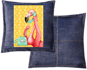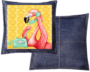 Liquid error (snippets/social-meta-info line 24): Unknown operator startswith PINK FLAMINGO ON THE PHONE1 with yellow background by Amélie Legault, Digitally printed by DenimINK on denim products: jackets, tote bags, throw pillows, table placemats, aprons. - Denim INK