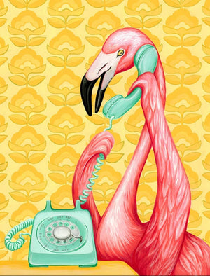 • Artwork description: A pink flamingo holding a mint green vintage telephone receiver to its beak, its long curved neck forming a looping arc above a matching rotary phone. the flamingo’s feathers are painted in layered pink and coral strokes, with a black-tipped beak and yellow eye.
