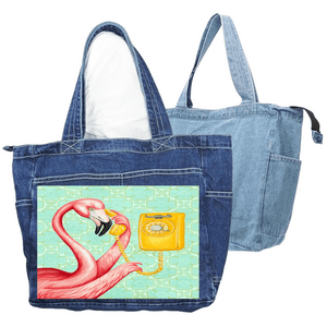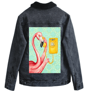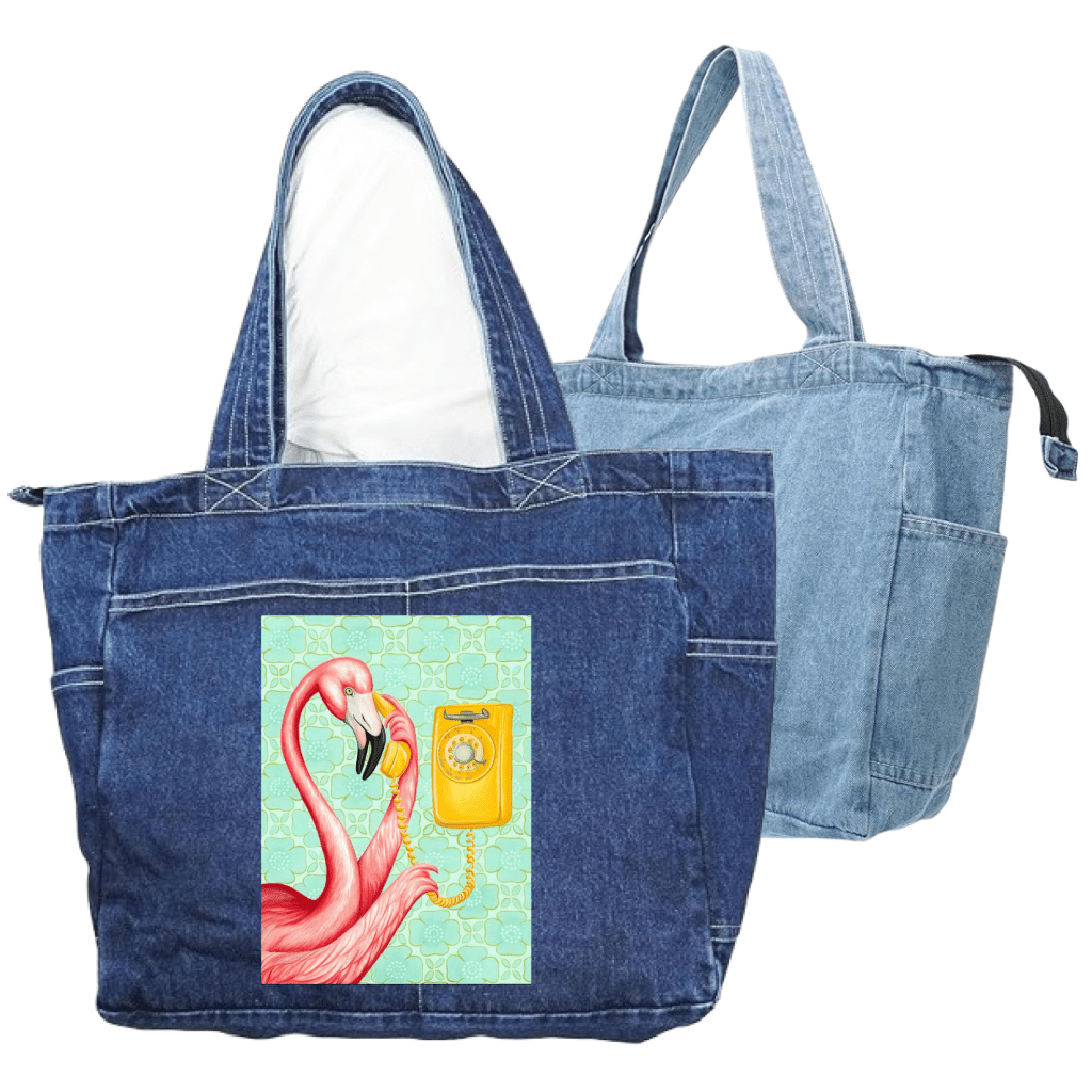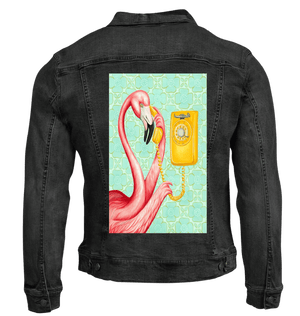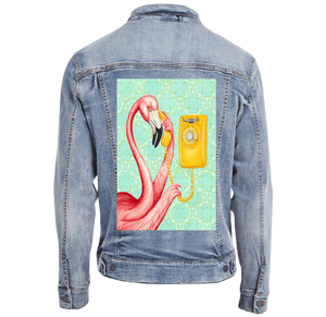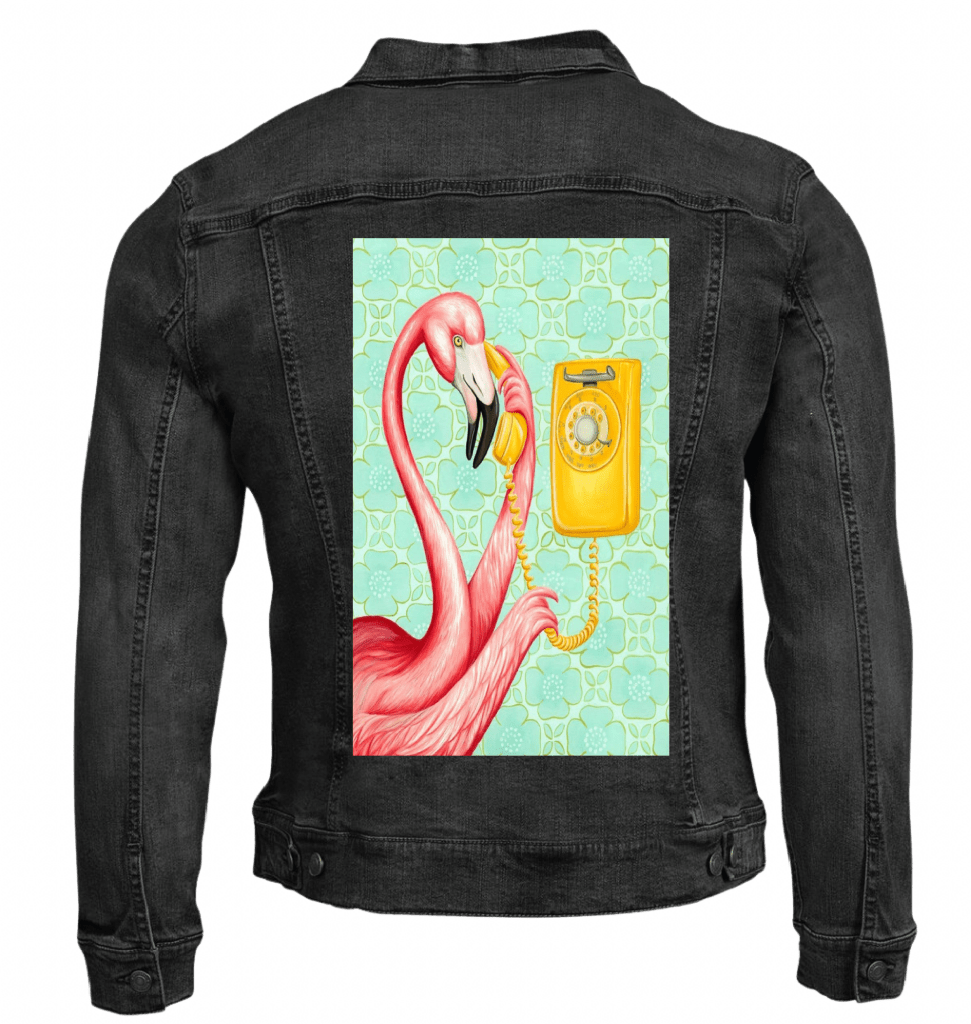this artwork lives on stonewashed denim, the pink feathers soften immediately.