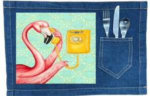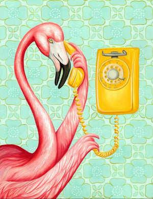 pink flamingo holding a yellow vintage rotary telephone receiver to its beak,