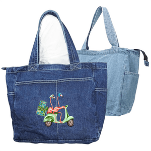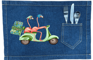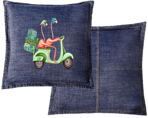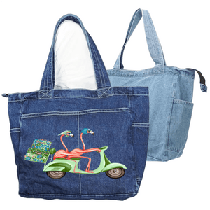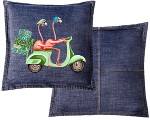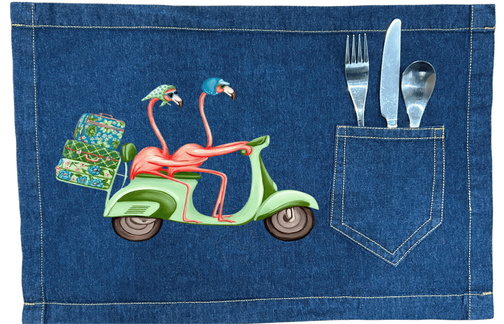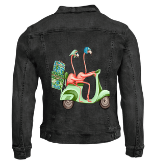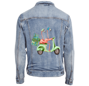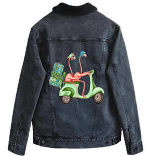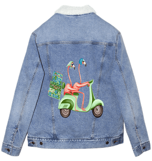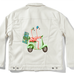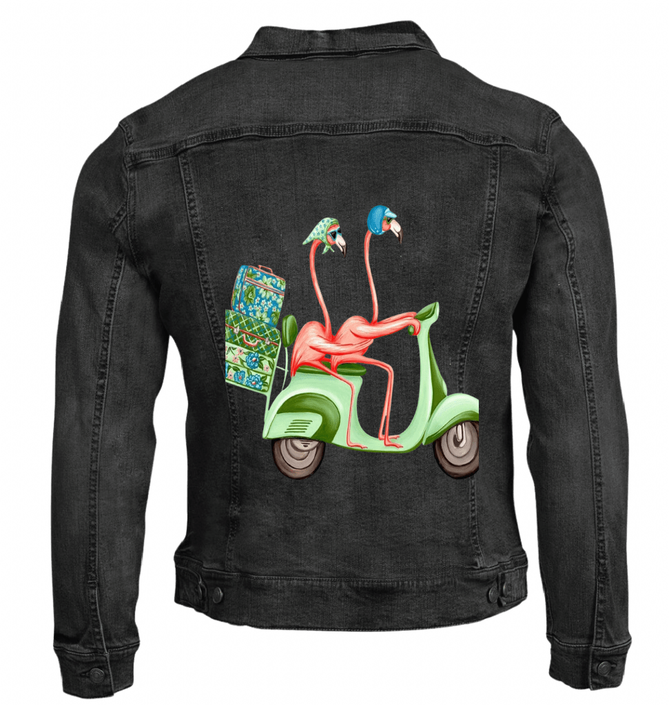 this artwork lives on stonewashed denim, the flamingos’ pinks soften and bloom.