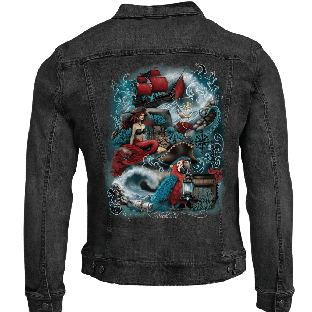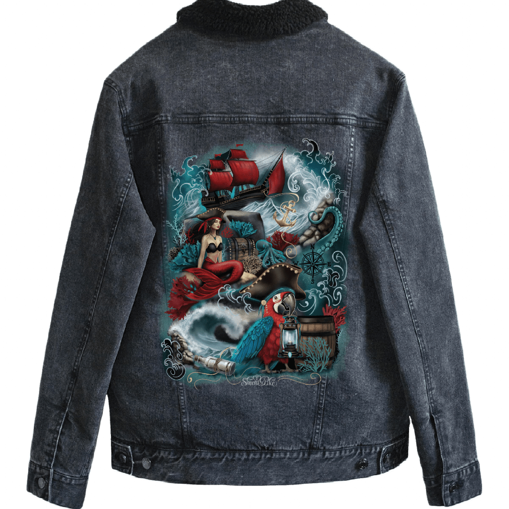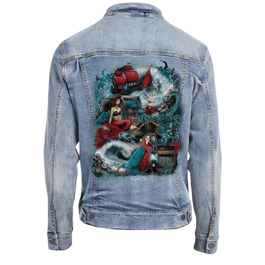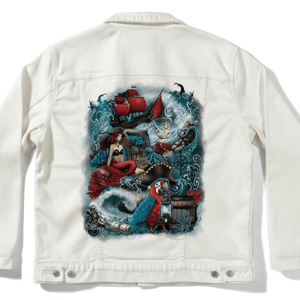 On white denim, clarity takes command. The red sails become bold and unmistakable, the mermaid’s scales sharply defined. Foam lines read crisp and energetic, and the compass rose becomes a clear graphic anchor. The lantern light contrasts brightly against the clean base, and the parrot’s feathers separate into vivid color bands.