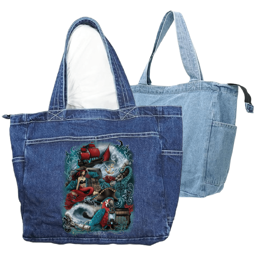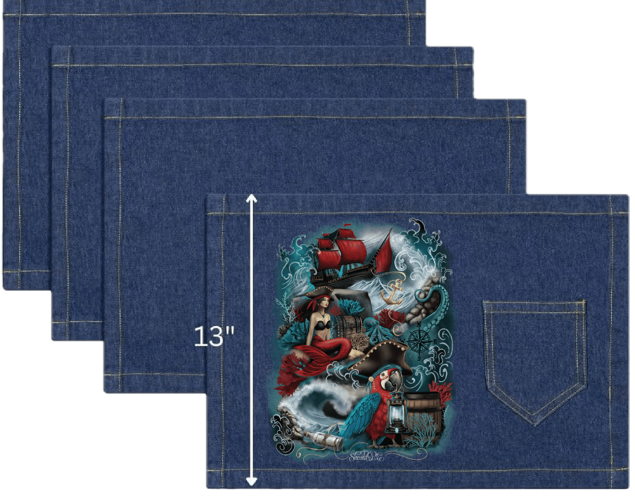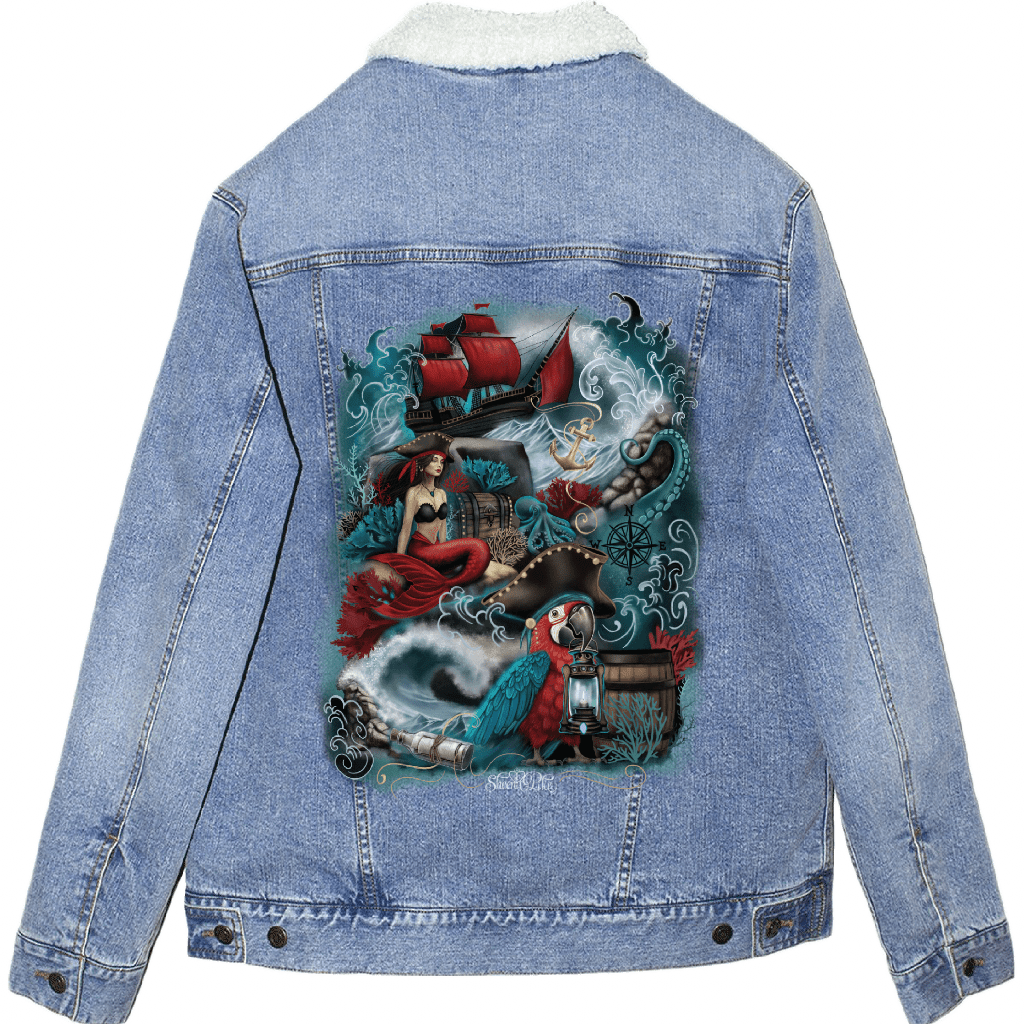 On white denim, clarity takes command. The red sails become bold and unmistakable, the mermaid’s scales sharply defined. Foam lines read crisp and energetic, and the compass rose becomes a clear graphic anchor. The lantern light contrasts brightly against the clean base, and the parrot’s feathers separate into vivid color bands.